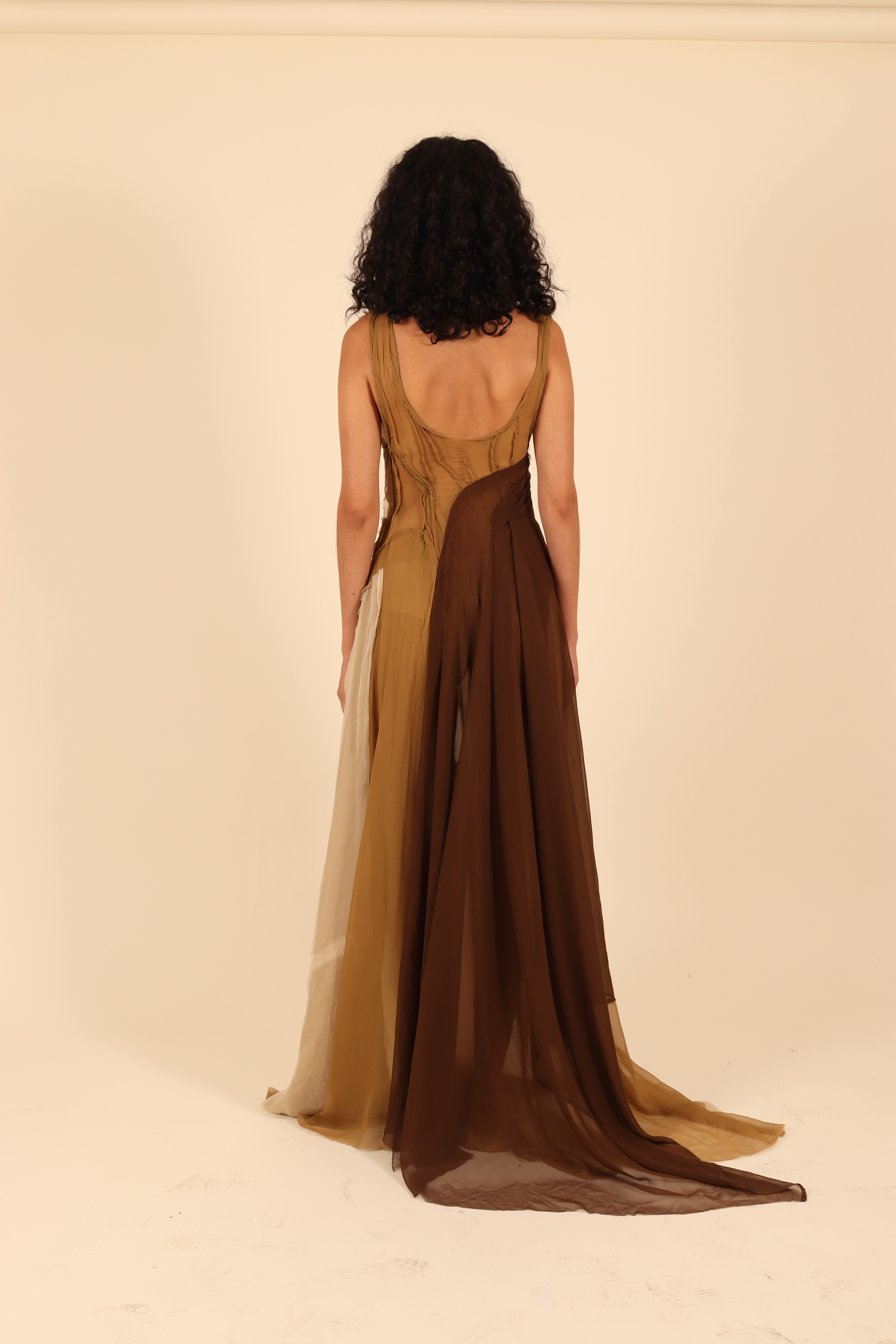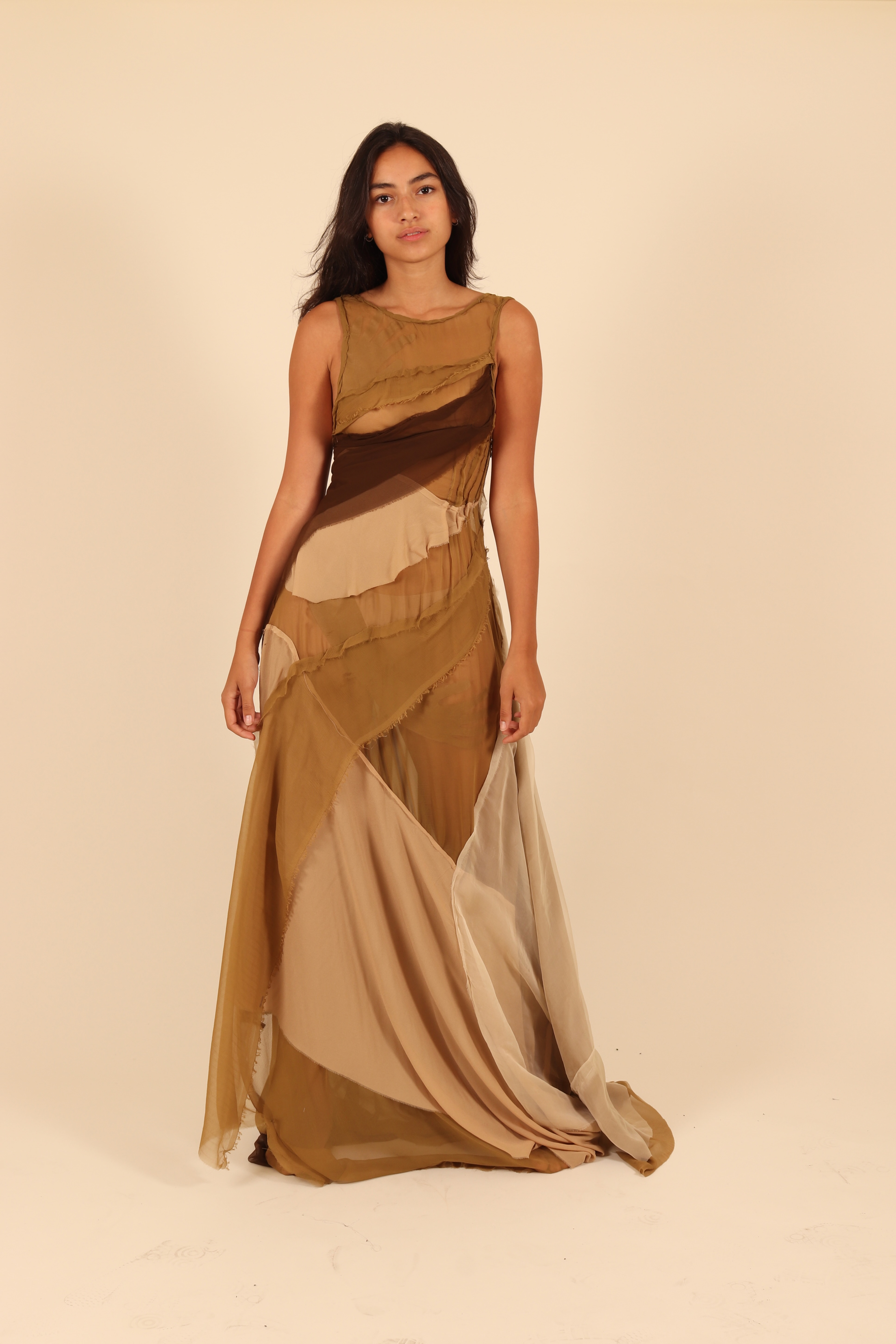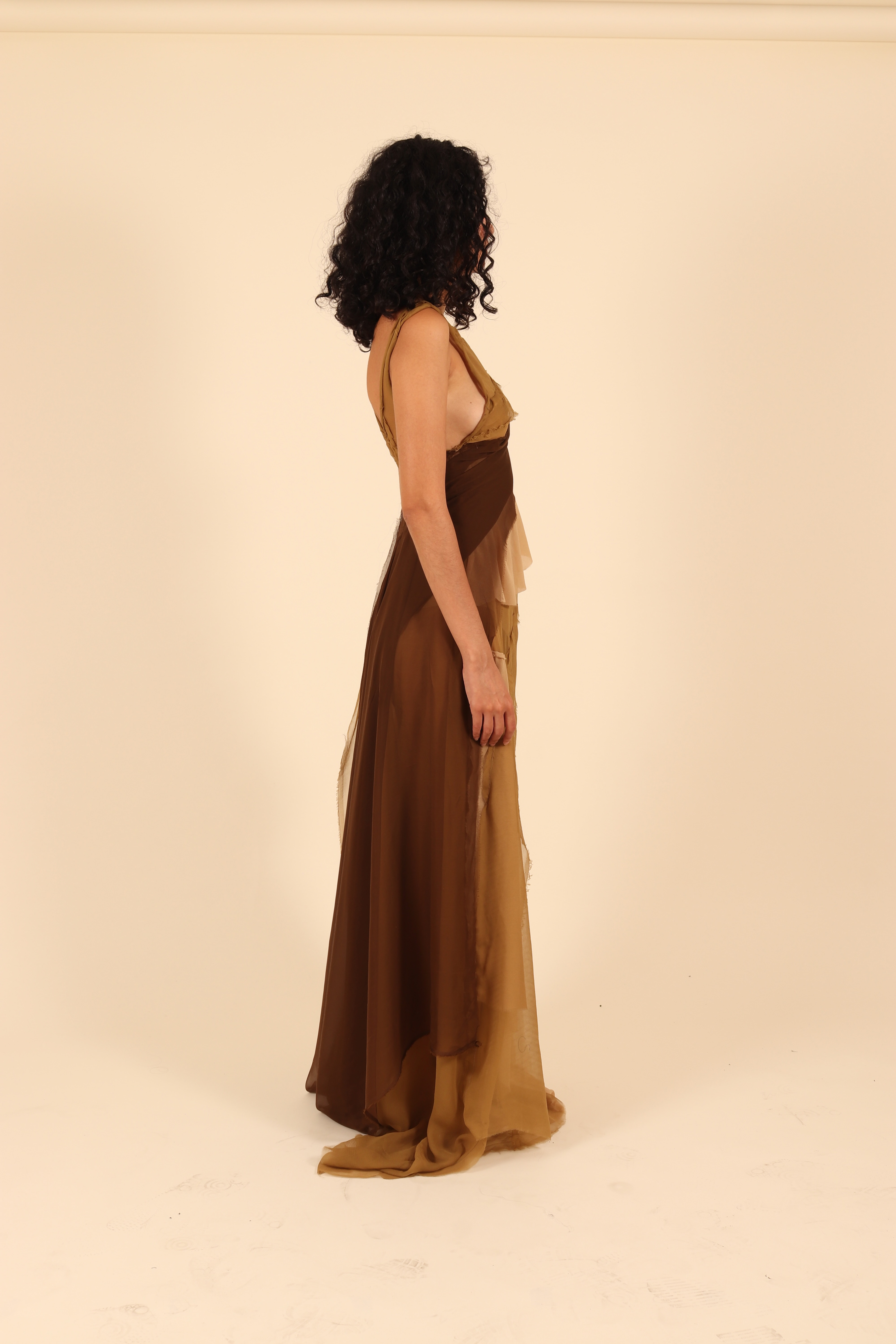 Dress: Silk chiffon with gauze, chiffon, and organza appliques.